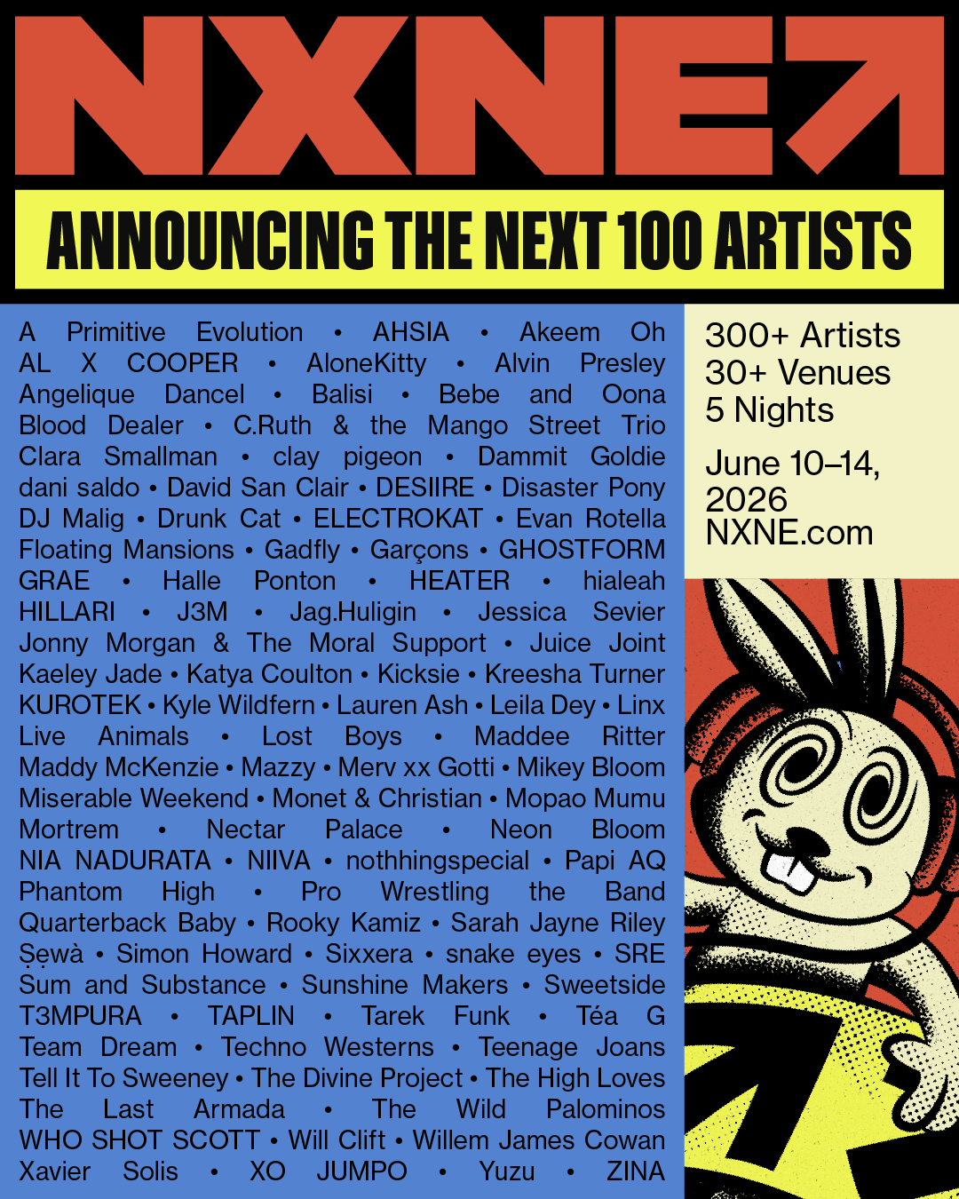 FIRST 100 ARTISTS ANNOUNCED TODAY – We’re thrilled and proud to announce 2026’s lineup of the first 100 emerging artists – each one standing out from a pool of more than 2,000 applications. Artists from Ontario, across Canada, and around the world will play 40-minute sets with a 20-minute changeover – NXNE’s signature format – in 30+ of Toronto’s best live music venues.