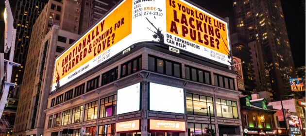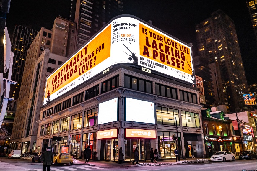 A series of cryptic billboards have taken over major downtown intersections, including Sankofa Square and Richmond & Spadina, confronting Torontonians with obtrusive questions: “Emotionally scarred and looking for love?” and “Is your love life lacking a pulse?” The messages direct singles and curious passersby to hotline number 855-274-3337 (855-BRIDE-DR) offering support by Dr. Euphronious – the groundbreaking scientistmatchmaker from The Bride!